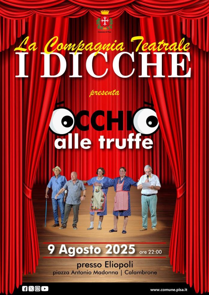 ELIOPOLI SUMMER 2025 ospita sabato 9 agosto alle ore 22 la commedia teatrale in vernacolo pisano “Occhio alle truffe” della compagnia I Dicche in collaborazione con l’assessore Gabriella Porcaro.