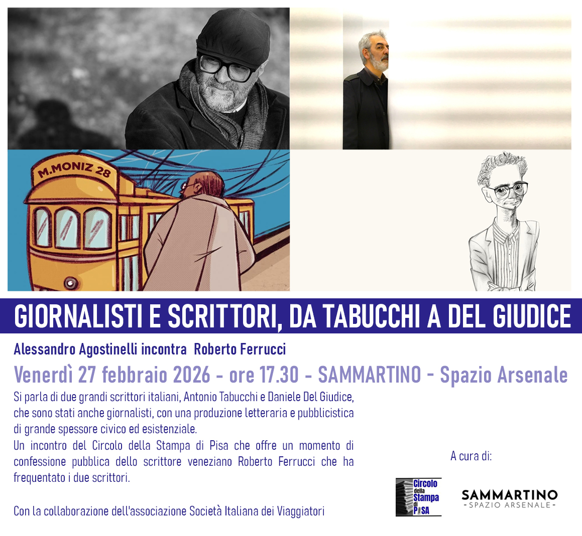 Venerdì 27 febbraio, alle ore 17.30, presso lo Spazio Arsenale Sammartino, in via San Martino a Pisa saranno protagonisti due grandi scrittori italiani: Antonio Tabucchi e Daniele Del Giudice. Entrambi hanno avuto, oltre a una larga fama europea come narratori i cui romanzi hanno appassionato moltissimi lettori, anche carriere giornalistiche su quotidiani importanti come Paese Sera, Corriere della Sera, Repubblica, El Pais, Le Monde. La loro produzione letteraria e pubblicistica è stata di grande spessore civile ed esistenziale.