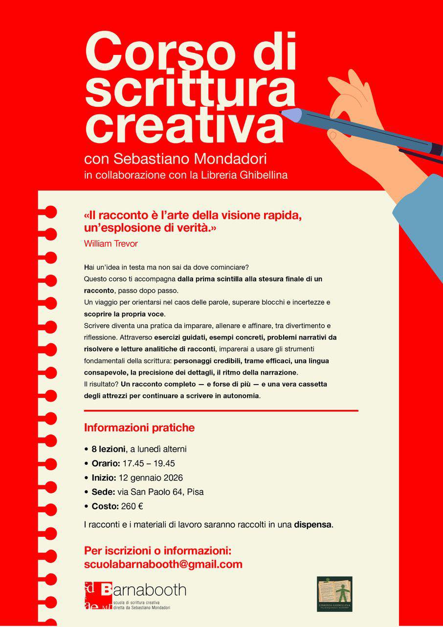 A Pisa, negli spazi della Libreria Ghibellina, partirà a gennaio un nuovo corso di scrittura creativa condotto da Sebastiano Mondadori, in collaborazione con la libreria. Il percorso, articolato in otto lezioni, propone un lavoro pratico e guidato che accompagna i partecipanti dalla nascita di un’idea fino alla stesura finale di un racconto.