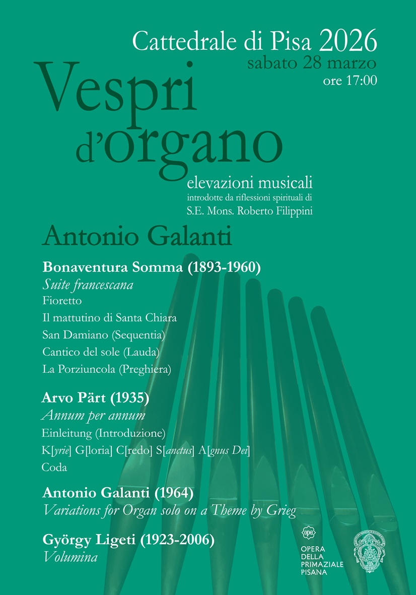Terzo appuntamento sabato 28 marzo alle ore 17 con la terza edizione di Vespri d’Organo in Cattedrale, la rassegna organizzata dall’Opera della Primaziale Pisana in collaborazione con il Capitolo Metropolitano, che unisce grande musica sacra e riflessione spirituale nella cornice del Duomo di Pisa.
