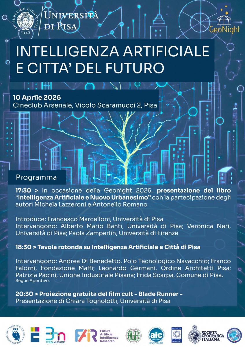 Sarà dedicato al rapporto tra tecnologia e sviluppo urbano l’evento “Intelligenza artificiale e città del futuro” organizzato dall’Università di Pisa per la Geonight 2026 e in programma venerdì 10 aprile alle 17.30 al Cinema Arsenale (in Vicolo Scaramucci 2 a Pisa). Promossa a livello internazionale da EUGEO e IGU, la Geonight rappresenta un’importante occasione per avvicinare il pubblico ai temi della geografia attraverso incontri divulgativi e momenti di partecipazione attiva.