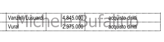 ACQUISTI – Sul fronte acquisti, Angori e Semper risultano entrambi a bilancio per una cifra di 1,4 milioni (2,8 complessivi). Cambiano invece due cifre che fino ad ora erano circolate in modo diverso: Lusuardi, risulta un investimento da 4.845.000 euro, mentre Vural è stato pagato 2.375.000 euro. Da quanto era emerso informalmente dalla società per il brasiliano era stata resa nota una cifra di mezzo milione, per il turco invece di 5-6 milioni. I valori a bilancio invece mostrano cifre completamente diverse che incolliamo anche a schermo di seguito. Confermato anche l’esborso per Mbambi, con 380 mila euro versati al Gent per l’acquisto dei diritti.