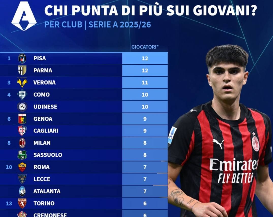 Subito dietro al Pisa per l’impiego dei giovani nati dal 2002 in poi, ci sono Parma, anch’essa con 12 giovani, e Verona con 11. Poi Como e Udinese con 10, seguite da Genoa e Cagliari a quota 9. A metà classifica Milan e Sassuolo (8), Roma, Lecce e Atalanta (7). Più indietro Torino, Cremonese e Fiorentina (6), Bologna con 5, Napoli e Inter con 4. Chiudono Juventus e Lazio, ferme a 3