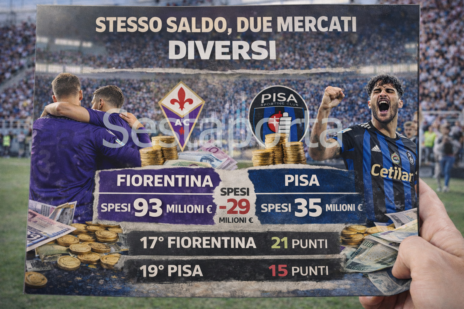 Guardando i numeri del mercato, Pisa e Fiorentina arrivano al derby con un dato quasi identico: un saldo negativo vicino ai 30 milioni. Tutto il resto cambia, e parecchio. Anche l’impatto sulla stagione.