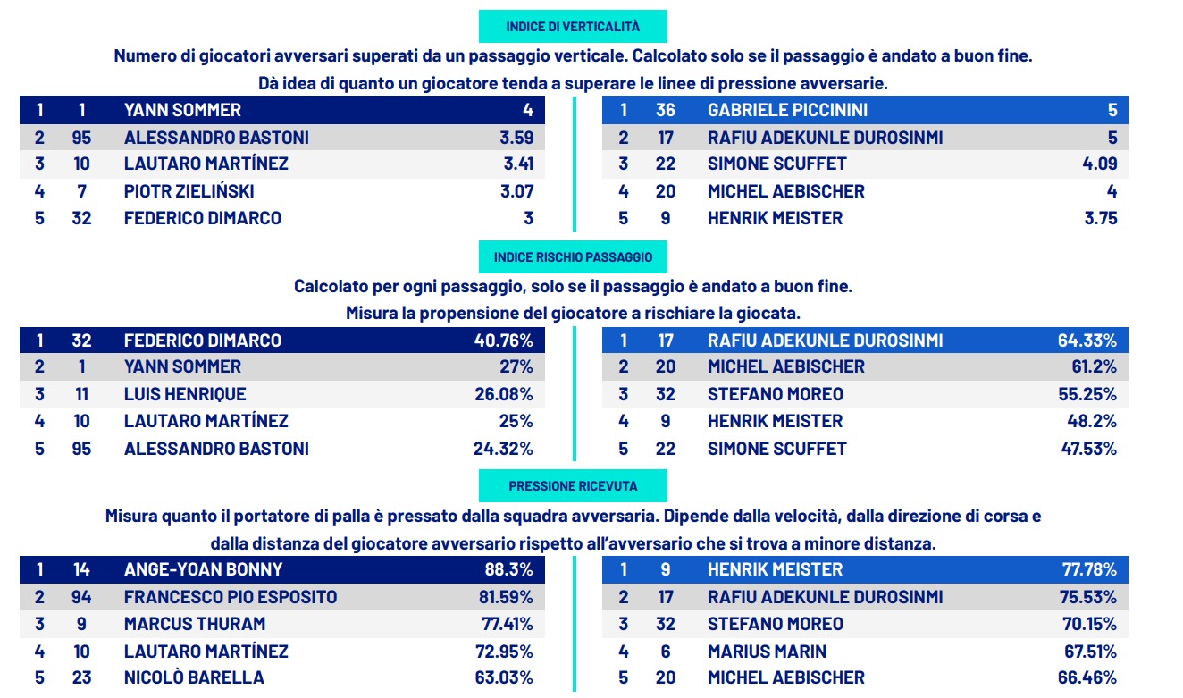 Ll’Inter ha avuto continuità per tutta la partita, anche quando è andato sotto per 0-2. Lo dicono i cross (42 tentati, 17 riusciti, da parte dei milanesi), la differenza nei passaggi completati (496 contro 228) e il fatto che i nerazzurri di Chivu abbiano costruito spesso e bene dentro l’area, arrivando ripetutamente in zona-gol. Qui si innesta anche la lettura sulle big chance. A San Siro ne ha create a raffica e, cosa ancora più decisiva, ha anche convertito sopra la sua media. Quando volume ed efficienza vanno a braccetto, il punteggio si allarga in fretta. Tra i numeri anche 20 passaggi chiave a 4, 176 passaggi riusciti nell’ultimo terzo contro 32, 288 giocate in avanti riuscite contro 75, . Insomma, numeri umilianti.