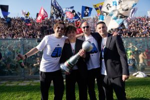 Bennardo (con la coppa della promozione in A) con Corrado, Vaira e Freggia