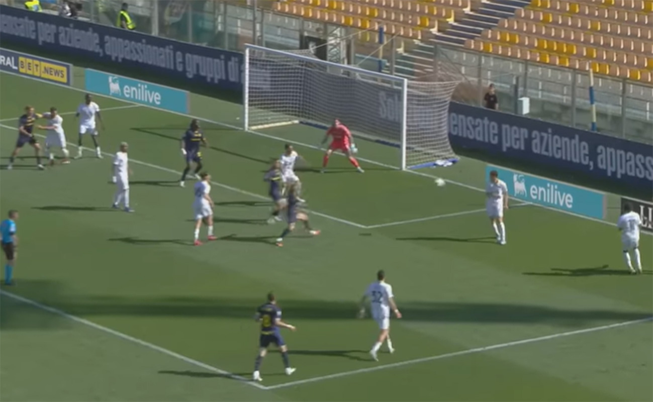 Tornando al gol subito, Elphege, come si vede dall’immagine di copertina, rimane completamente solo e libero di calciare. Un altro errore gravissimo della difesa