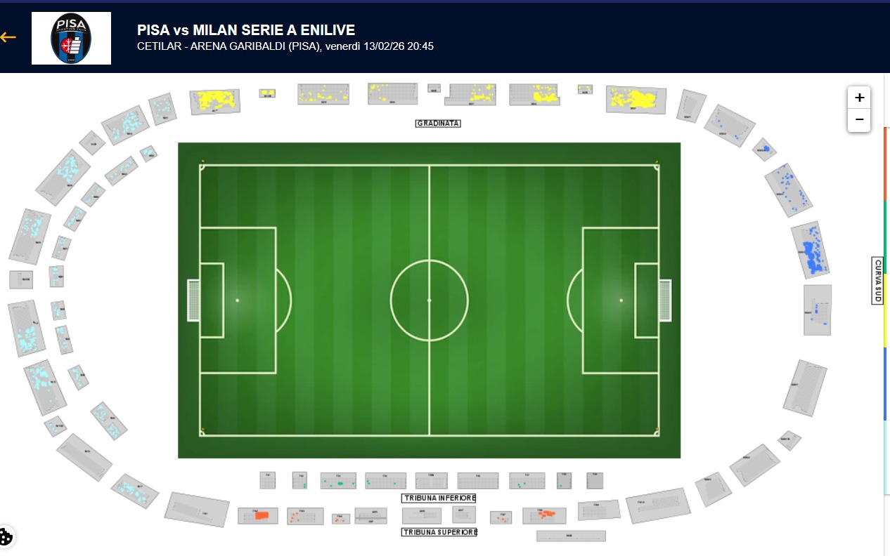Alla chiusura dei punti vendita fisici (ore 19), la prima giornata di prevendita per Pisa-Milan si è chiusa con numeri importanti ma ancora lontani dal tutto esaurito. Restano infatti oltre duemila i biglietti ancora disponibili per la sfida dell’Arena Garibaldi di venerdì 16 Febbraio, e la sorpresa è che buona parte di questi si trova nei posti a disposizione dei pisani.