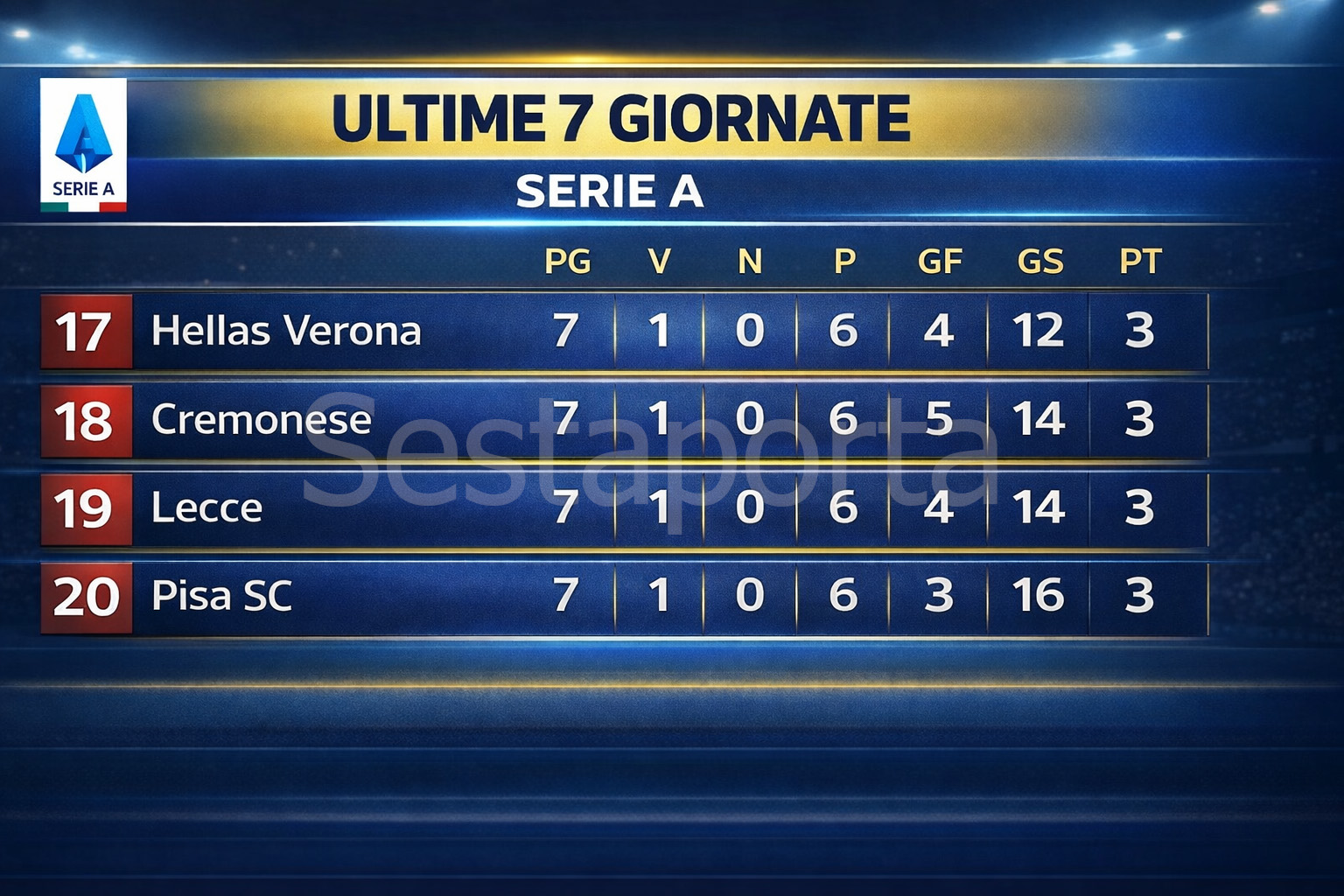 Il Pisa resta fermo. E insieme a lui anche la lotta salvezza, almeno per quanto riguarda le squadre in fondo alla classifica. I numeri delle ultime sette giornate raccontano tutto: Hellas Verona, Cremonese, Lecce e il Pisa hanno ottenuto gli stessi punti, appena tre a testa. Bastava poco. Davvero poco. Anche solo quattro o sei punti in più e oggi il discorso sarebbe diverso, con i nerazzurri ancora pienamente dentro la corsa salvezza.