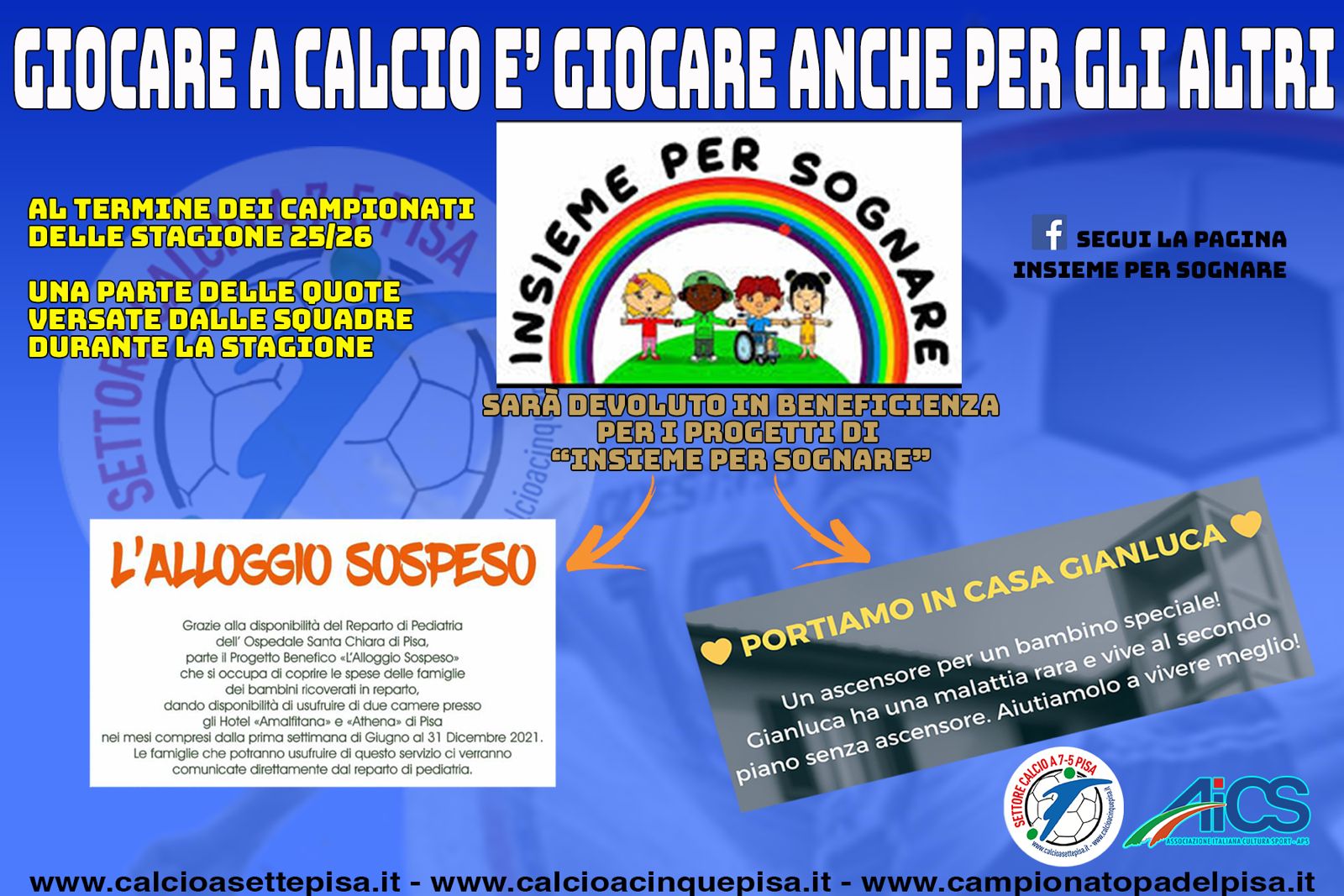 Al termine della stagione sportiva 2025/26, una parte delle quote versate dalle squadre sarà devoluta ai progetti dell’associazione “Insieme per Sognare”, tra cui l’“Alloggio Sospeso” e altre iniziative dedicate al sostegno dei bambini e delle loro famiglie. Un modo semplice ma potente per trasformare il calcio in un gesto di solidarietà, dove ogni partita contribuisce a costruire qualcosa di più grande.